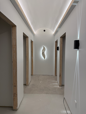 A stylish, laid-back atmosphere with comfortable seating, entertainment options, a private dressing room, and a mini kitchenette.